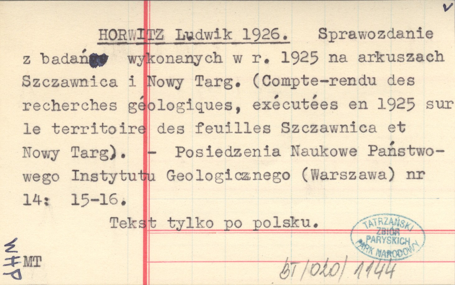 HORWITZ Ludwik 1926 Sprawozdanie z badań wykonanych w r. 1925 na arkuszach Nowy Targ i Szczawnica. (Compte-rendu des recherches géologiques, exécutées en 1925 sur le territoire des feuilles Szczawnica et Nowy Targ).