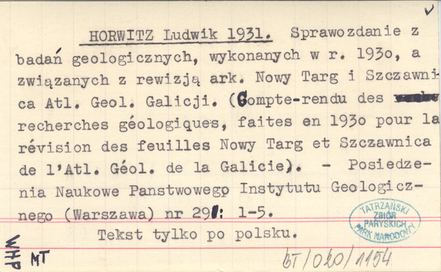 HORWITZ Ludwik 1931 Sprawozdanie z badań geologicznych, wykonanych w r. 1930, a związanych z rewizją ark. Nowy Targ i Szczawnica Atl. Geol. Galicji. (Compte-rendu des recherches géologiques, faites en 1930 pour la révision des feuilles Nowy Targ et Szczawnica de l'Atl. Géol. de la Galicie).