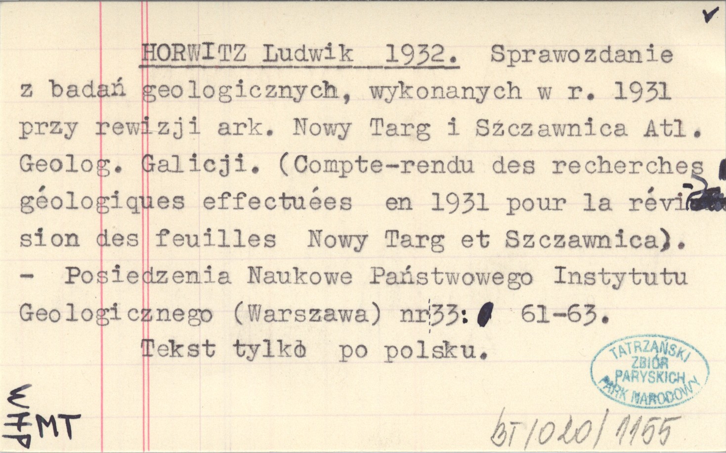 HORWITZ Ludwik 1932 Sprawozdanie z badań geologicznych, wykonanych w r. 1931, przy rewizji ark. Nowy Targ i Szczawnica Atl. Geol. Galicji. (Compte-rendu des recherches géologiques effecués en 1931 pour la révision des feuilles Nowy Targ et Szczawnica).