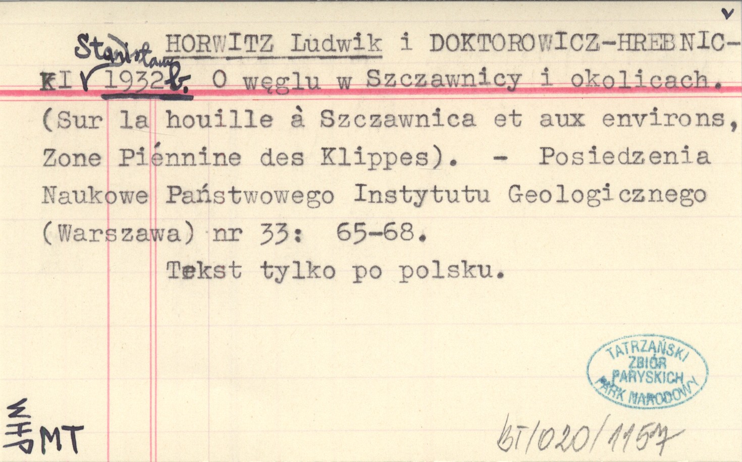 HORWITZ Ludwik DOKTOROWICZ-HREBNICKI, Stanisław. ; 1932 b O węglu w Szczawnicy i okolicach. (Sur la houille á Szczawnica et aux environs, Zone Piénnine des Klippes).