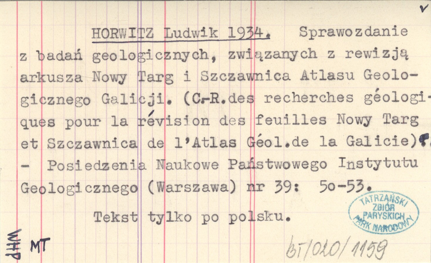 HORWITZ Ludwik 1934 Sprawozdanie z badań geologicznych, związanych z rewizją arkusza Nowy Targ i Szczawnica Atlasu Geolologicznego Galicji. (C.-R. des recherches géologiques pour la révision des feuilles Nowy Targ et Szczawnica de l'Atlas Géol. de la Galicie).