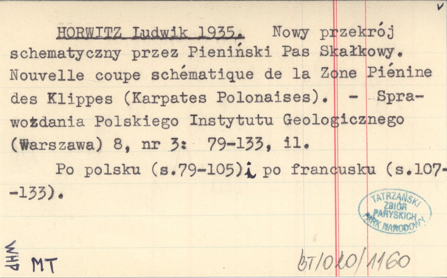HORWITZ Ludwik 1935 Nowy przekrój schematyczny przez Pieniński Pas Skałkowy. Nouvelle coupe schématique de la Zone Piénine des Klippes (Karpates Polonaises).