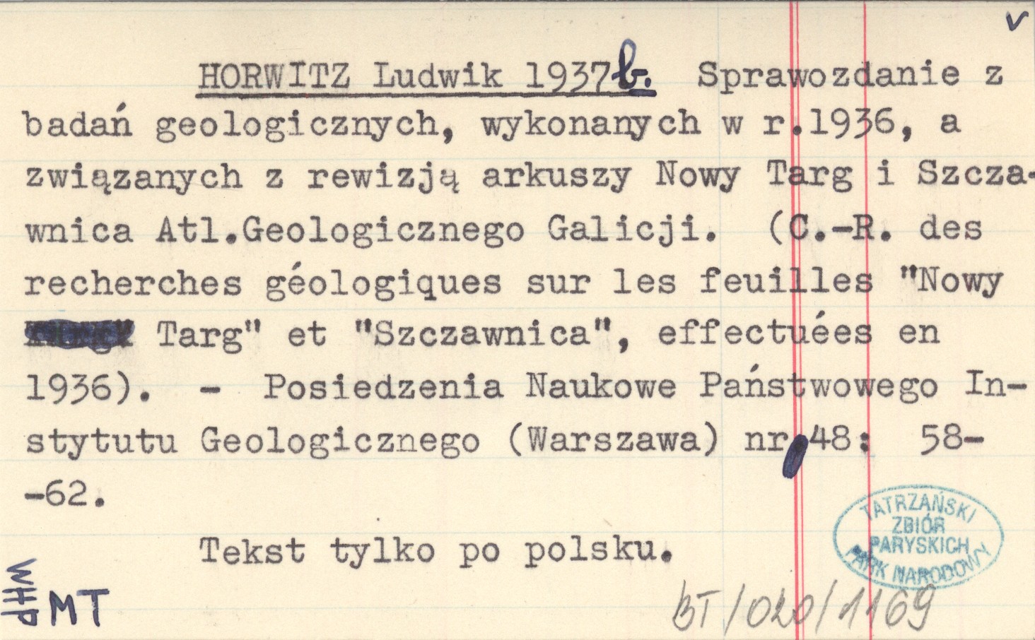 HORWITZ Ludwik 1937 b Sprawozdanie z badań geologicznych, wykonanych w r. 1936, a związanych z rewizją arkuszy Nowy Targ i Szczawnica Atl. Geologicznego Galicji. (C.-R. des recherches géologiques sur les feuilles "Nowy Targ" et "Szczawnica", effectuées en 1936).