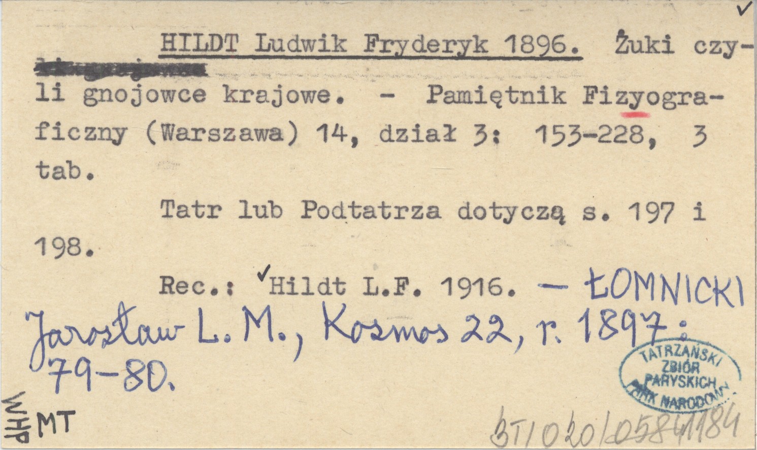Pamiętnik Fizyograficzny (Warszawa) , 14, dz. 3: 153-228, 2 k. Tatr i Podtatrza dotyczą S. 197 i 198. REC: Hildt L. F. 1916. ŁOMNICKI Jarosław L. M., Kosmos 22, r. 1897: 79-80.