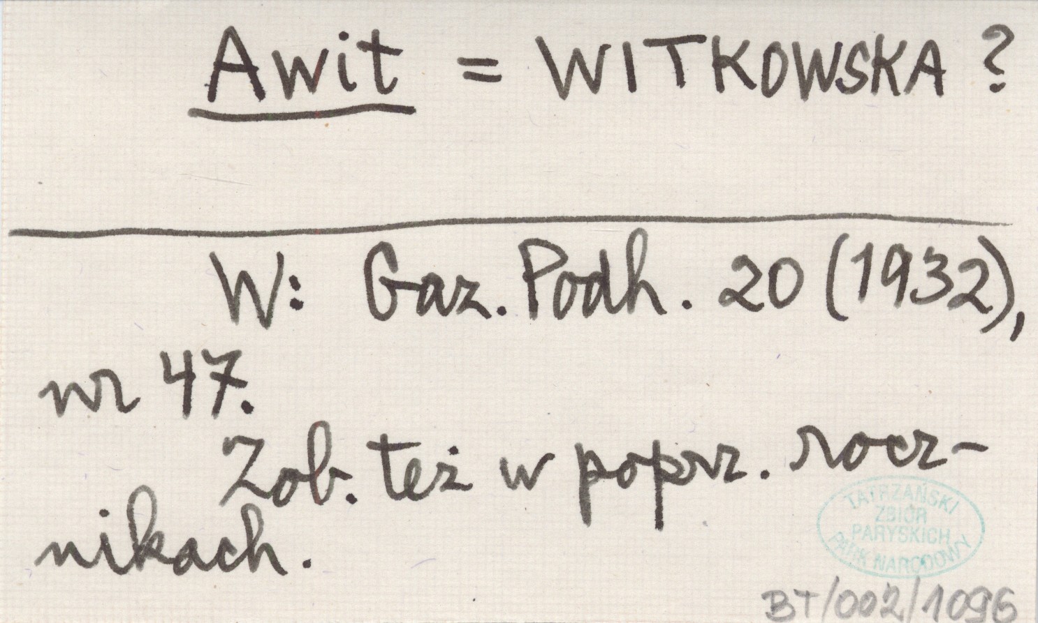Awit WITKOWSKA Gazeta Podhalańska 20 (1932), nr 47. Witkowska? Zob. też. w poprz. rocznikach.