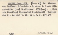 HOUDEK Ivan 1932 Dr. Alexander Húščava: Kolonizácia Liptova do konca XIV. staročia. [...] Bratislava, 1903 [...].