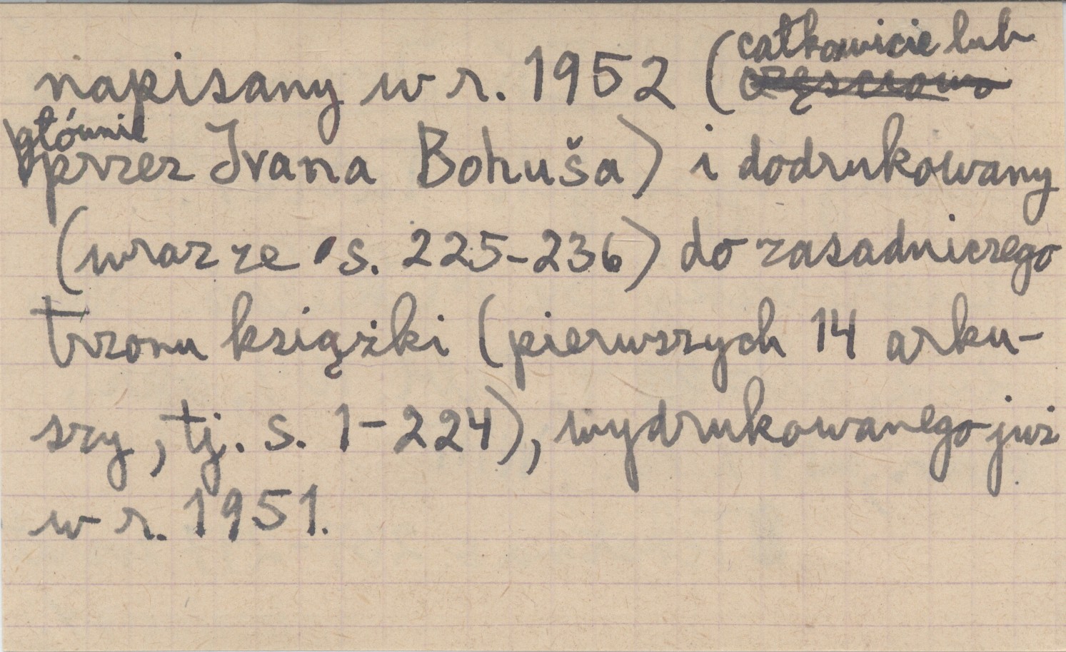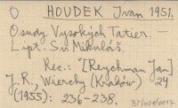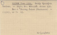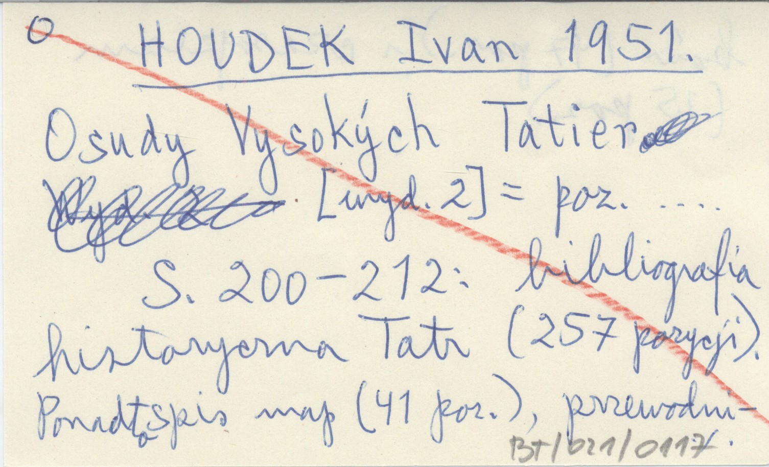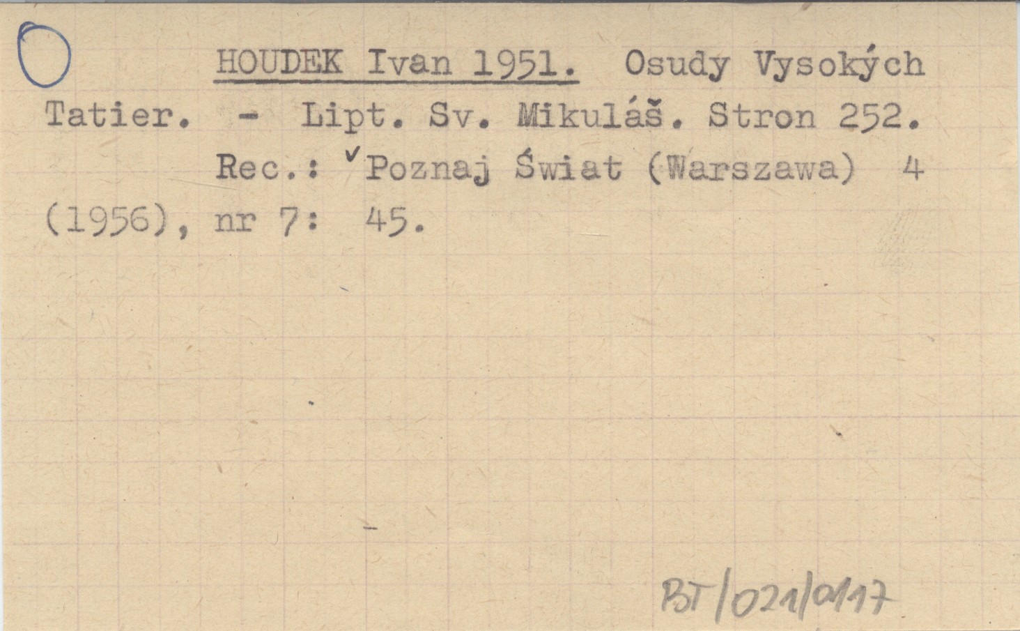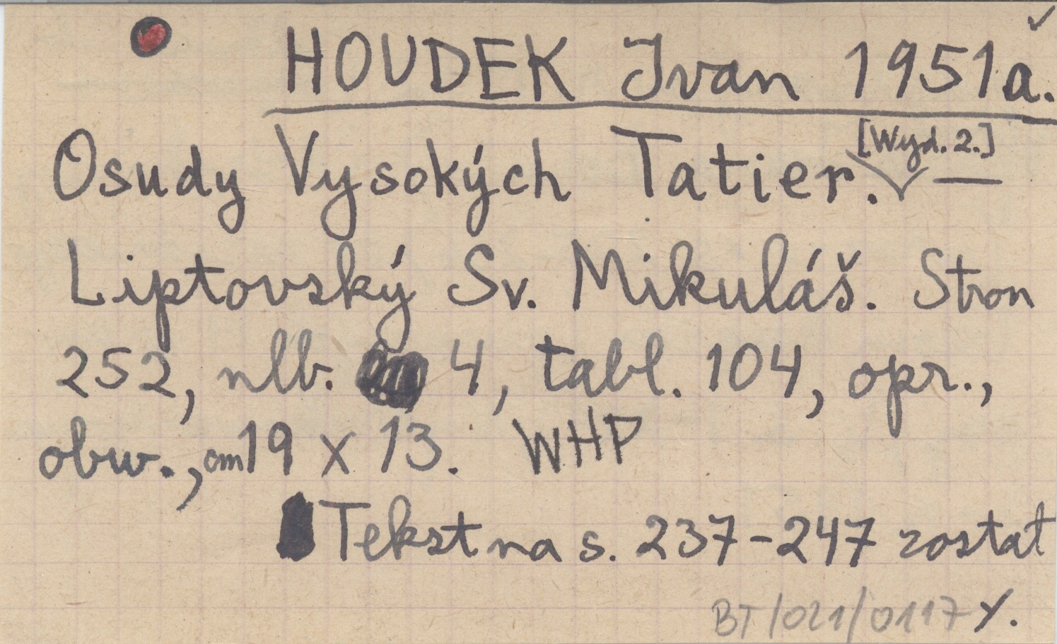 Liptovský Svätý Mikuláš , 252 s., [4], 104 k., opr., obw., 19x13 cm. S. 200-212: bibliografia historyczna Tatr (257 pozycji). Ponadto spis map (41 poz.), przewodników (47 poz.) i czasopism (15 poz.). Tekst na S. 237-247 został napisany w r. 1952 (całkowicie lub głównie przez Ivana Bohuša) i dodrukowany (wraz ze S. 225-236) do zasadniczego trzonu książki (pierwszych 14 k., tj. S. 1-224), wydrukowanego już w r. 1951. REC: Poznaj Świat (Warszawa) 4 (1956), nr 7: 45. [Reychman Jan] J. R., Wierchy (Kraków) 24 (1955): 236-238.
