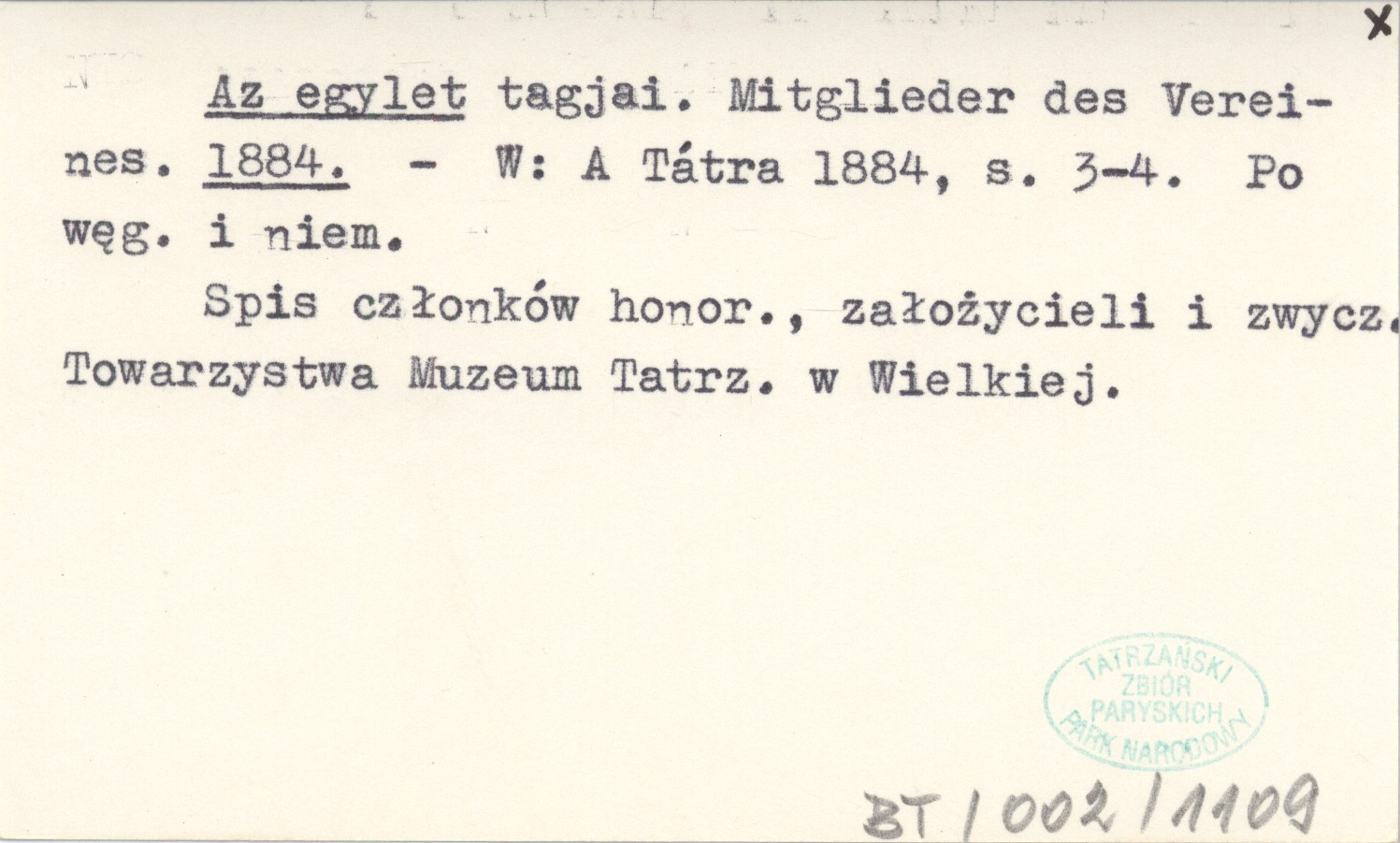 A Tátra. , S. 3-4. Spis członków honor., założycieli i zwycz. Towarzystwa Muzeum Tatrz. w Wielkiej. Po węg. i niem.