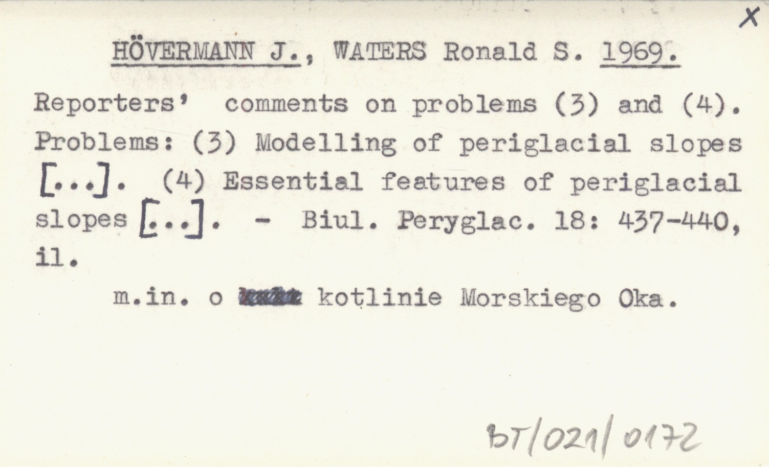 HÖVERMANN J. WATERS, Ronald S. ; 1969 Reporters' comments on problems (3) and (4). Problems: (3) Modelling of periglacial slopes [...]. (4) Essential features of periglacial slopes [...].