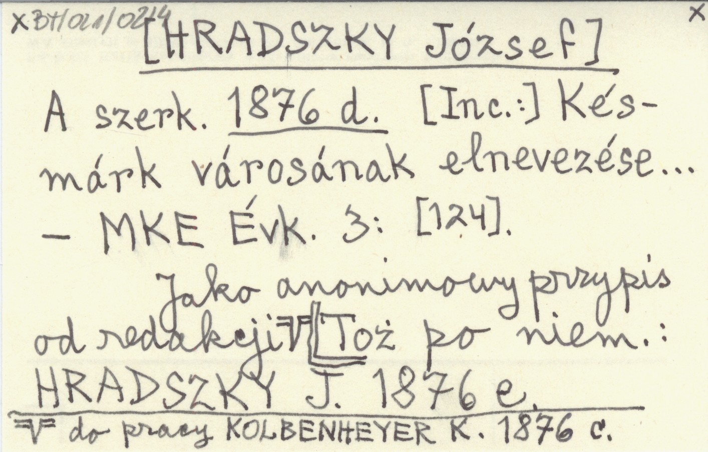 A Magyarországi Kárpát Egyesület Évkönyve, 3: [124]. [Inc.:]. Jako anonimpwy przypis od redakcji do pracy KOLBENHEYER K. 1876 c. Toż po niemicku: HRADSZKY J. 1876 e.