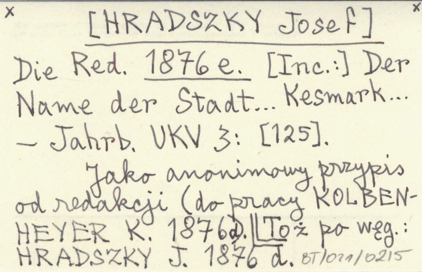 Jahrbuch des Ungarischen Karpathen-Vereines, 3: [125]. [Inc.:]. Jako anonimowy przypis od redakcji (do pracy KOLBENHEYER K. 1876 d.). Toż po węgiersku: HRADSZKY J. 1876 d.