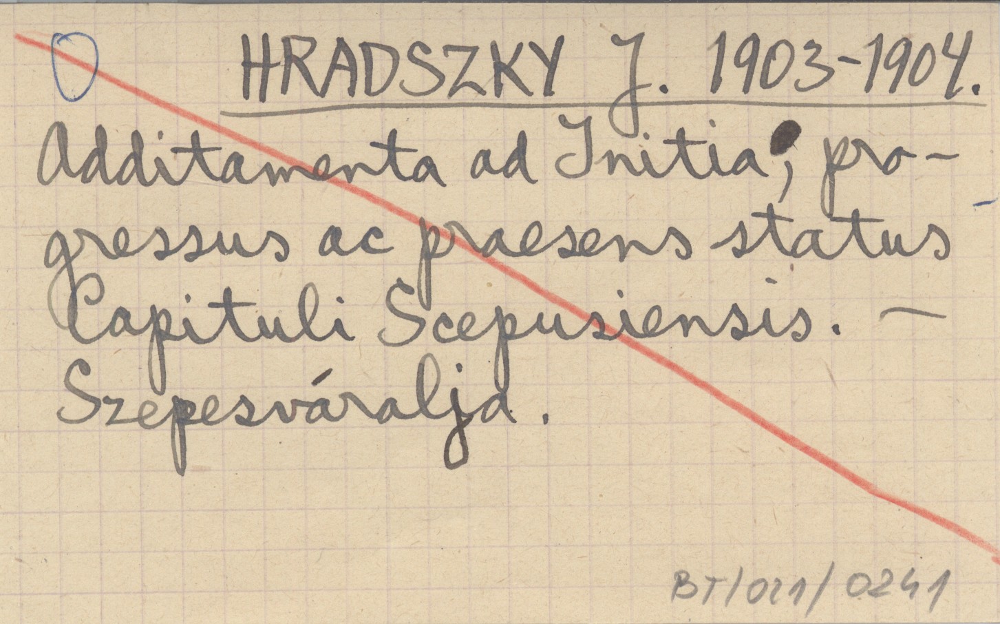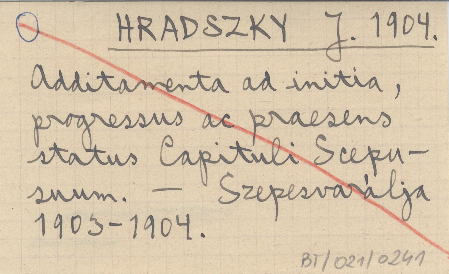 HRADSZKY J. 1903-1904 Additamenta ad Initia, progressus ac praesens status Capituli Scepusiensis.