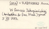 (aza) ZADZIORKO Anna Gazeta Zakopiańska Przed 5 XII 1993. Dodatek do Gazety Krakowskie.