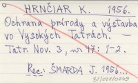HRNČIAR K. 1956 Ochrana prírody a výstavba vo Vysokýcz Tatrách.