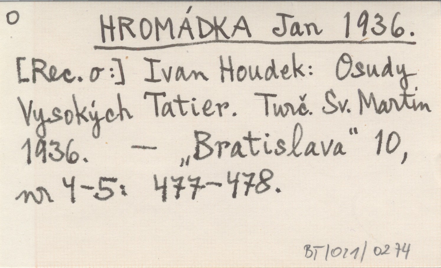 HROMÁDKA Jan 1936 Ivan Houdek: Osudy Vysokęch Tatier. Turèiansky Svätę Martin 1936.