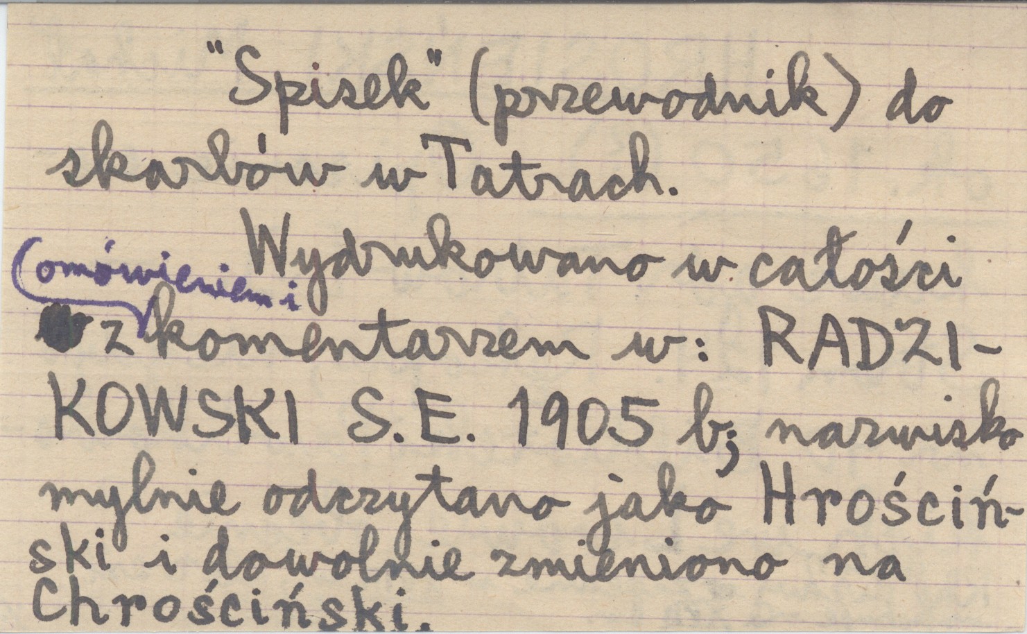 , 124 s. "Spisek" (przewodnik) do skarbów w Tatrach. Rękopis, niegdyś nr 40 Biblioteki Pawlikowskich we Lwowie, obecnie rękopis (kopia?) pisany zapewne w XVIII w., ale treść wskazuje na XVII w. Wydrukowano w całości z omówieniem i komentarzem w: RADZIKOWSKI S. E. 1905 b; nazwisko mylnie odczytano jako Hrościński i dowolnie zmieniono na Chrościński. Pozycja ta jest podobna ale nie identyczna z pozycjami: Trakt 1849 i Opisanie 1883. Recenzje podane przy: RADZIKOWSKI S. E. 1905 b.