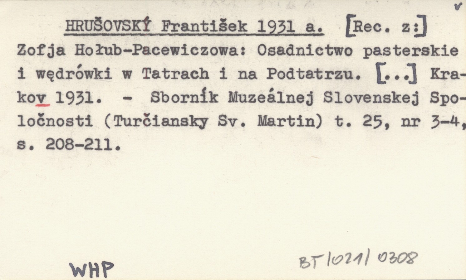 HRUŠOVSKÝ František 1931 a Zofja Hołub-Pacewiczowa: Osadnictwo pasterskie i wędrówki w Tatrach i na Podtatrzu. [...] Krakov 1931.