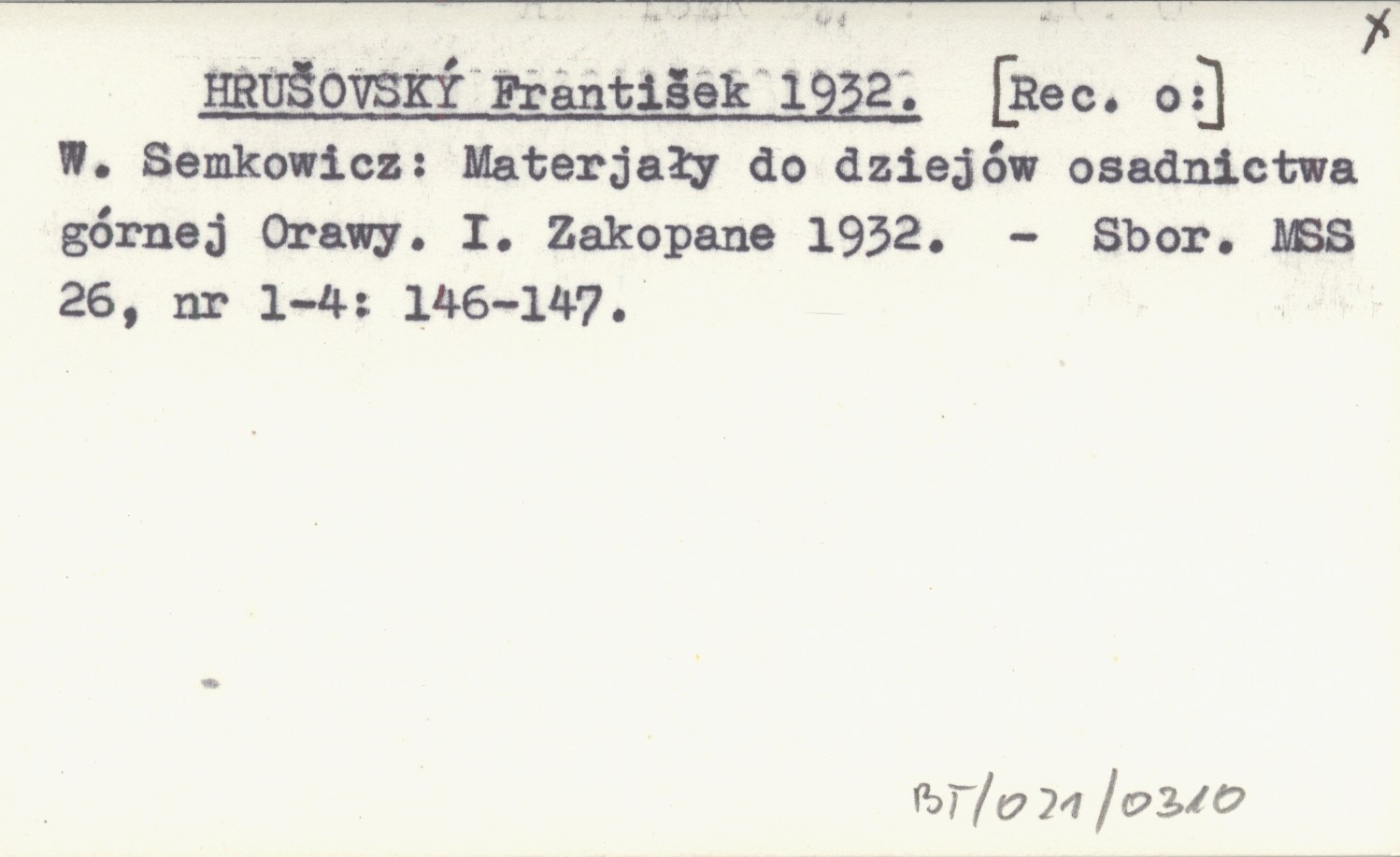 HRUŠOVSKÝ František 1932 W. Semkowicz: Materjały do dziejów osadnictwa górnej Orawy. I. Zakopane 1932.