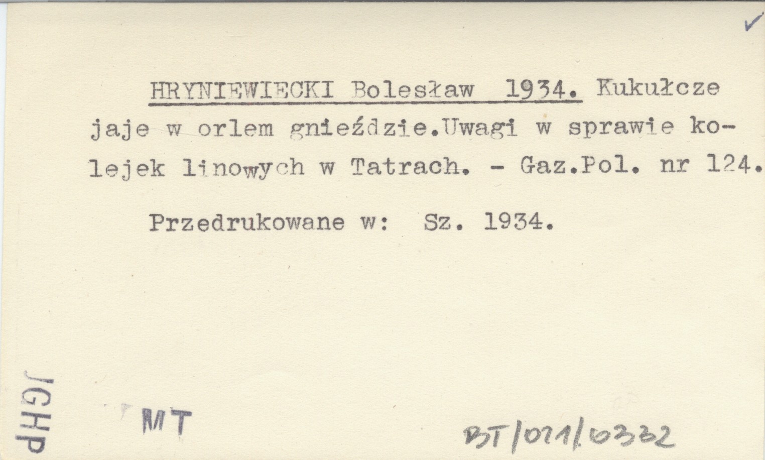 HRYNIEWIECKI Bolesław 1934 Kukułcze jaje w orlem gnieździe. Uwagi w sprawie kolejek linowych w Tatrach.