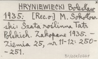 HRYNIEWIECKI Bolesław 1935 M. Sokołowski: Szata roślinna Tatr Polskich. Zakopane 1935.