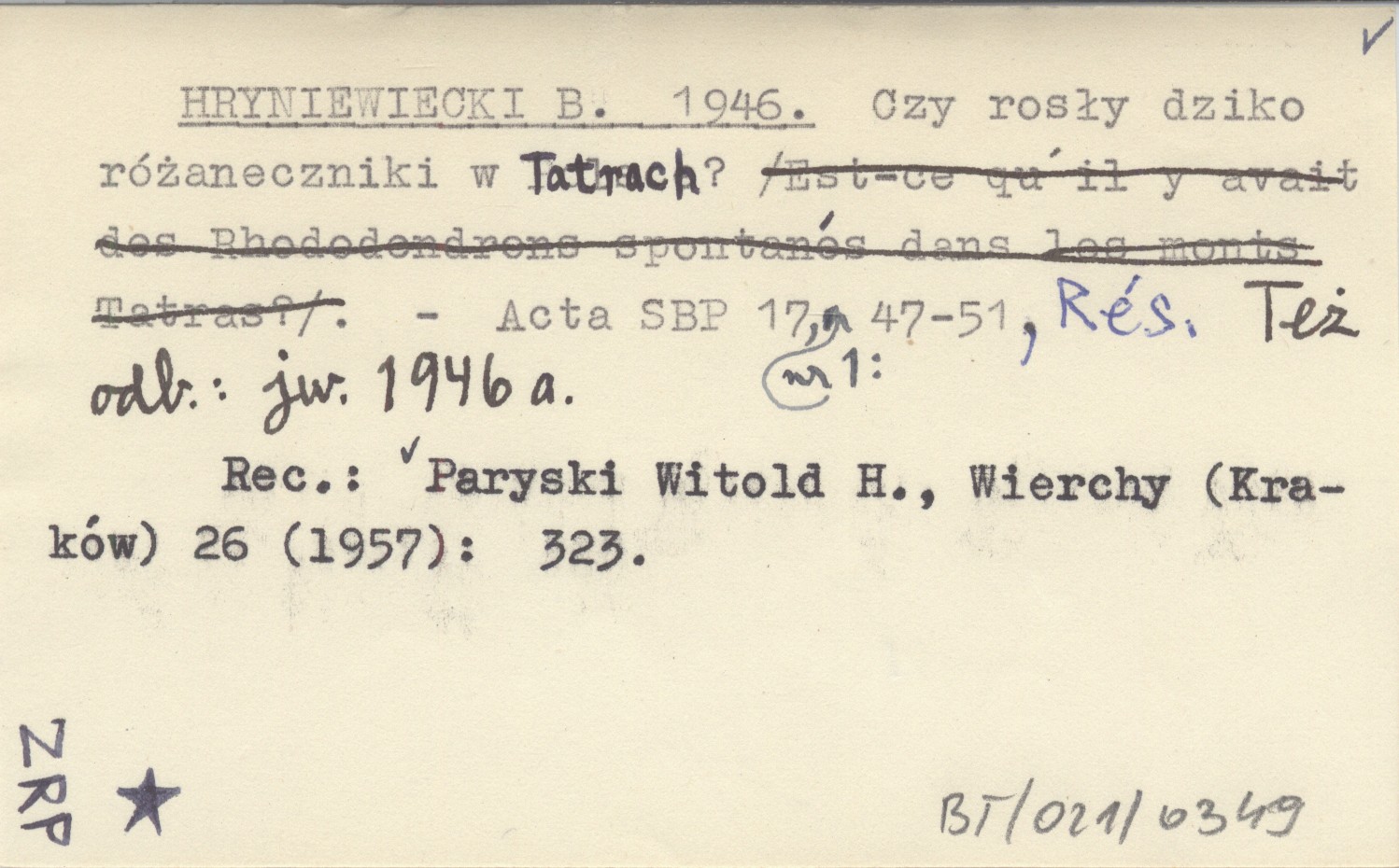 HRYNIEWIECKI B. 1946 Czy rosły dziko różaneczniki w Tatrach?