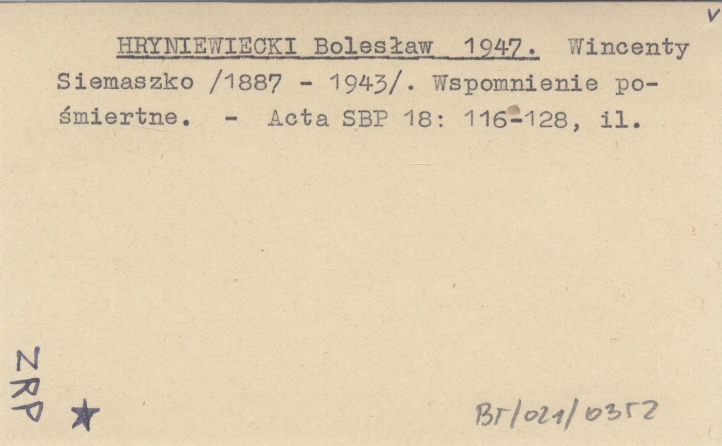 HRYNIEWIECKI Bolesław 1947 Wincenty Siemaszko (1887-1943). Wspomnienie pośmiertne.