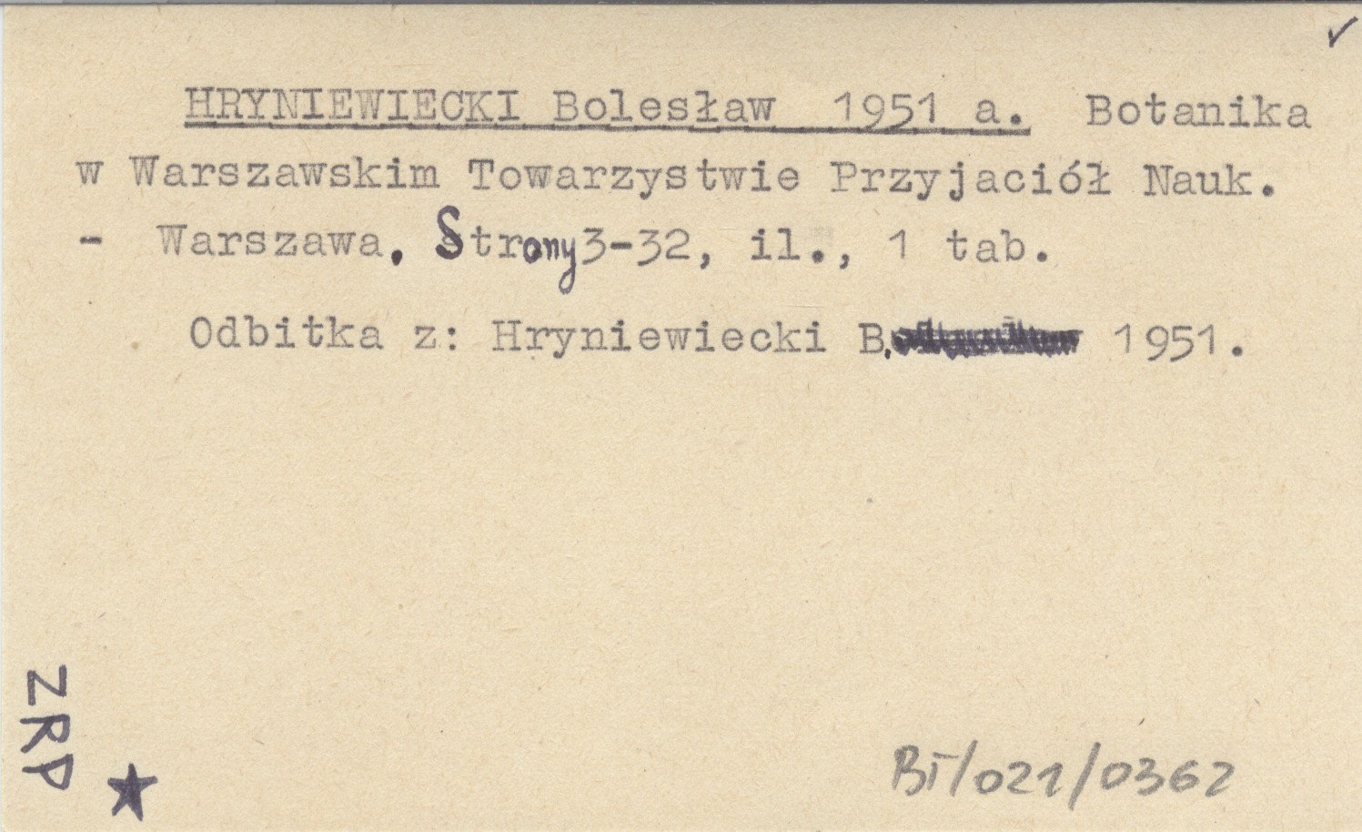 HRYNIEWIECKI Bolesław 1951 a Botanika w Warszawskim Towarzystwie Przyjaciół Nauk.