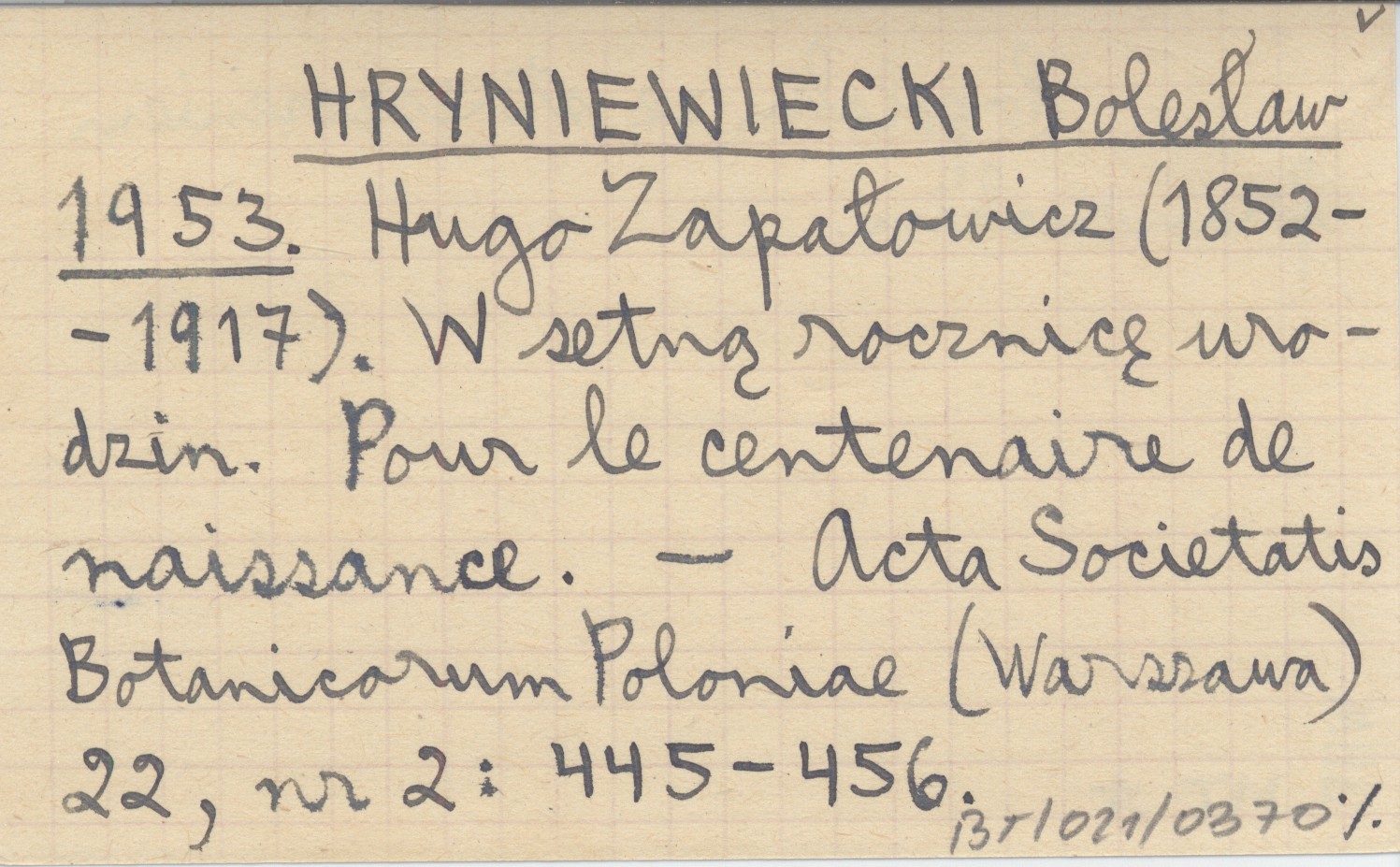 HRYNIEWIECKI Bolesław 1953 Hugo Zapałowicz (1852-1917). W setną rocznicę urodzin. Pour le centenaire de naissance.