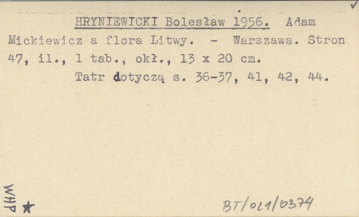 HRYNIEWIECKI Bolesław 1956 Adam Mickiewicz a flora Litwy.
