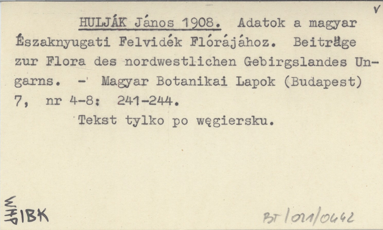 HULJÁK János 1908 Adatok a magyar Északnyugati Felvidék Flórájához. Beiträge zur Flora des nordwestlichen Gebirgslandes Ungarns.