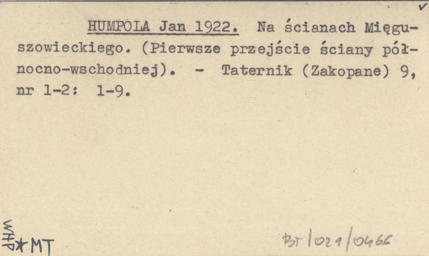 HUMPOLA Jan 1922 Na ścianach Mięguszowieckiego. (Pierwsze przejście ściany północno-wschodniej).