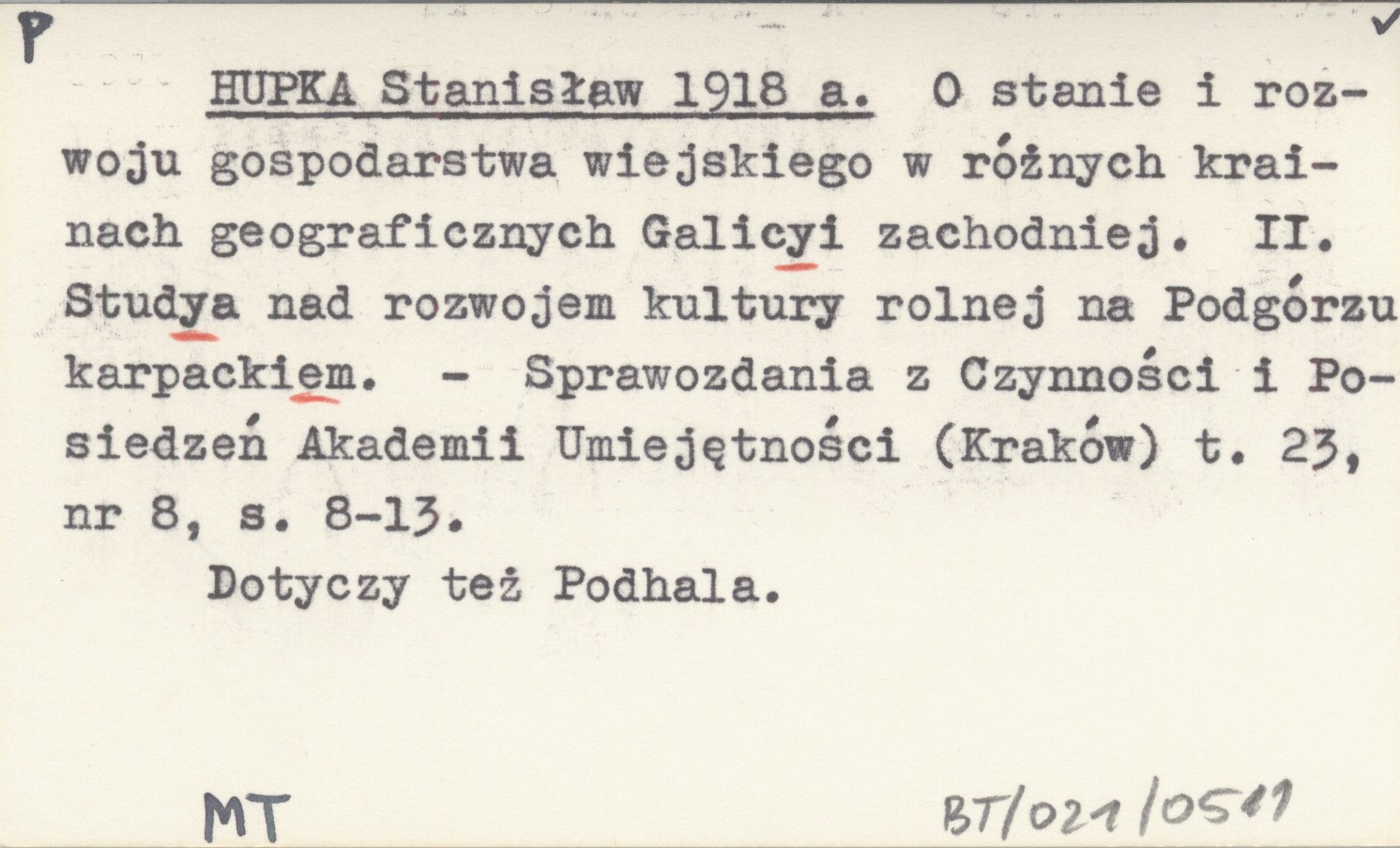 HUPKA Stanisław 1918 a O stanie i rozwoju gospodarstwa wiejskiego w różnych krainach geograficznych Galicyi zachodniej. II. Studya nad rozwojem kultury rolnej na Podgórzu karpackiem.