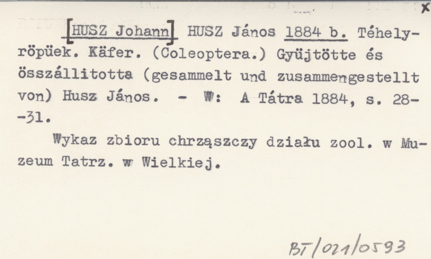 HUSZ János [HUSZ Johann] 1884 b Téhelyröpüek. Käfer. (Coleoptera). Gyüjtötte és összállitotta (gesammelt und zusammengestellt von) Husz János.