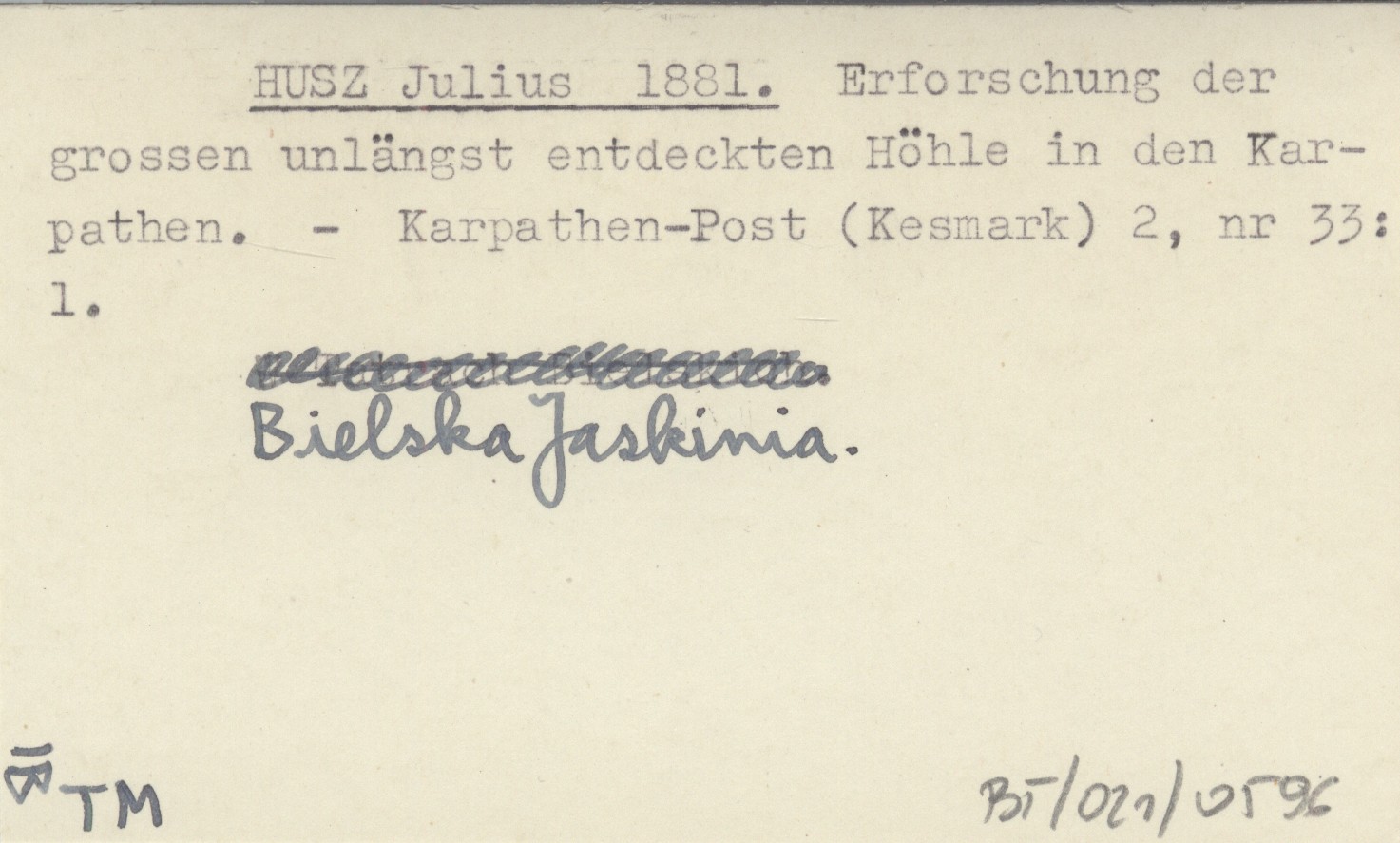 HUSZ Julius 1881 Erforschung der gorssen unlängst entdeckten Höhle in den Karpathen.