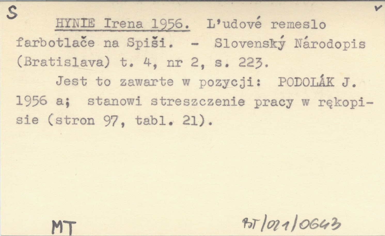Slovenský Národopis (Bratislava) , T. 4, nr 2: 223. Jest to zawarte w pozycji: PODOLÁK J. 1956 a; stanowi streszczenie pracy w rękopisie (97 s., 21 k.).