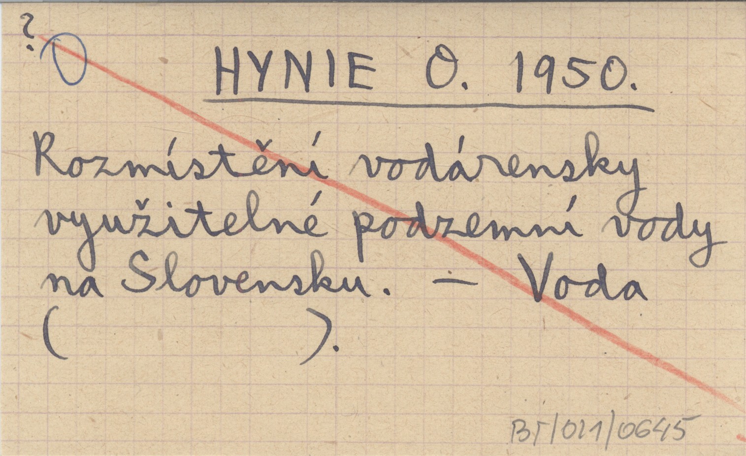 HYNIE O. 1950 Rozmístění vodárensky využitelné podzemní vody na Slovensku.