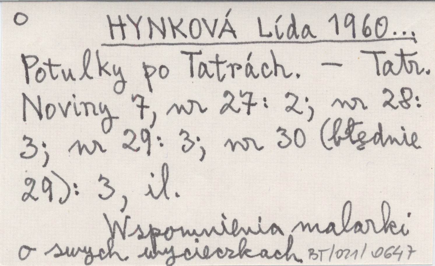 Tatranské Noviny, 7, nr 27: 2; nr 28: 3; nr 29: 3; nr 30 (bł. 29): 3, il. Wspomnienia malarki o swych wycieczkach.