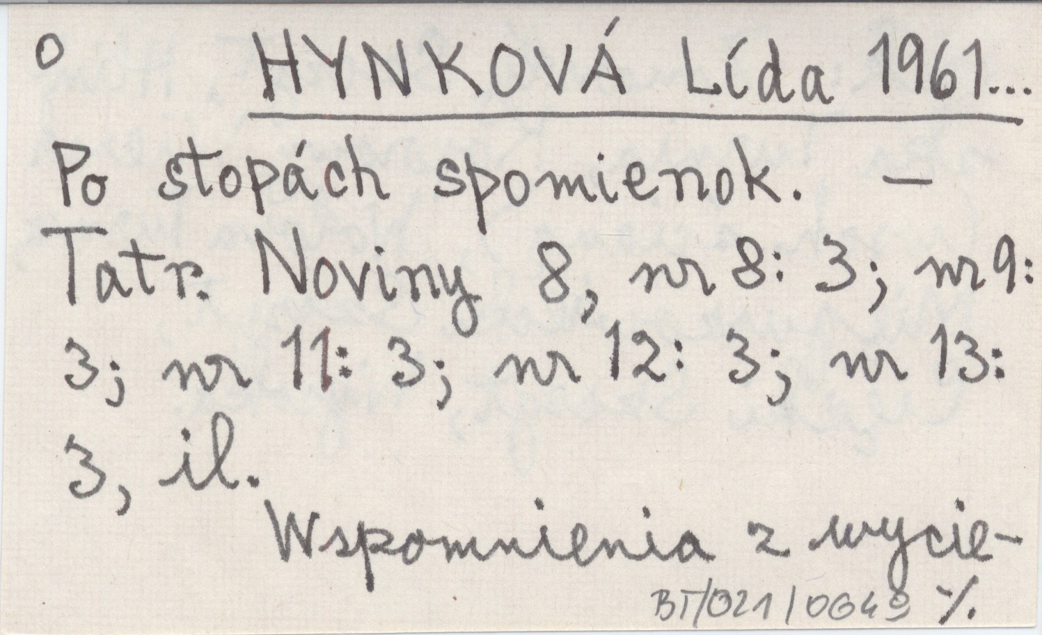 Tatranské Noviny, 8, nr 8: 3; nr 9: 3; nr 11: 3; nr 12: 3; nr 13: 3, il. Wspomnienia z wycieczek: Zmarzły Szczyt, Hlińska Turnia, Koprowy Wierch (wsch. ścianą), Wołowa Turnia, Mięguszowiecki Szczyt, Ciężki Szczyt, Wysoka.