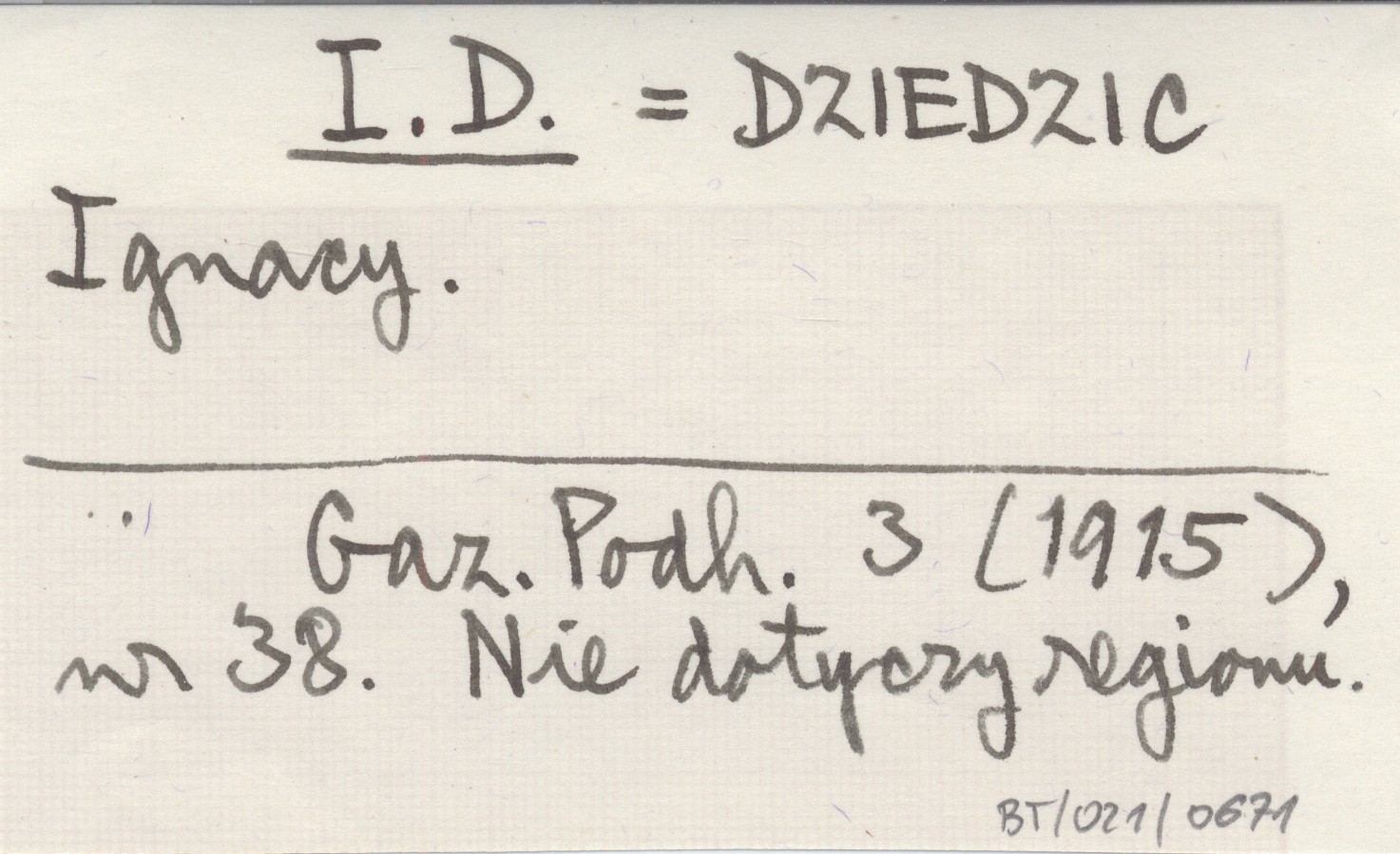 I. D. DZIEDZIC Ignacy Gazeta Podhalańska 3 (1915), nr 38. Nie dotyczy regionu.