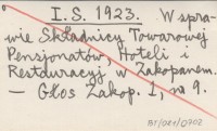 I. S. 1923 W sprawie Składnicy Towarowej Pensjonatów, Hoteli i Restauracyj w Zakopanem.