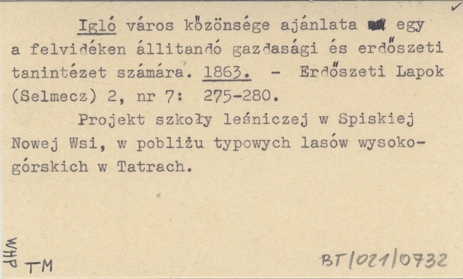 Igló város kőzönsége ajénlata egy a felvidéken állitandó gazdasági és erdőszeti tanintézet számára. 1963
