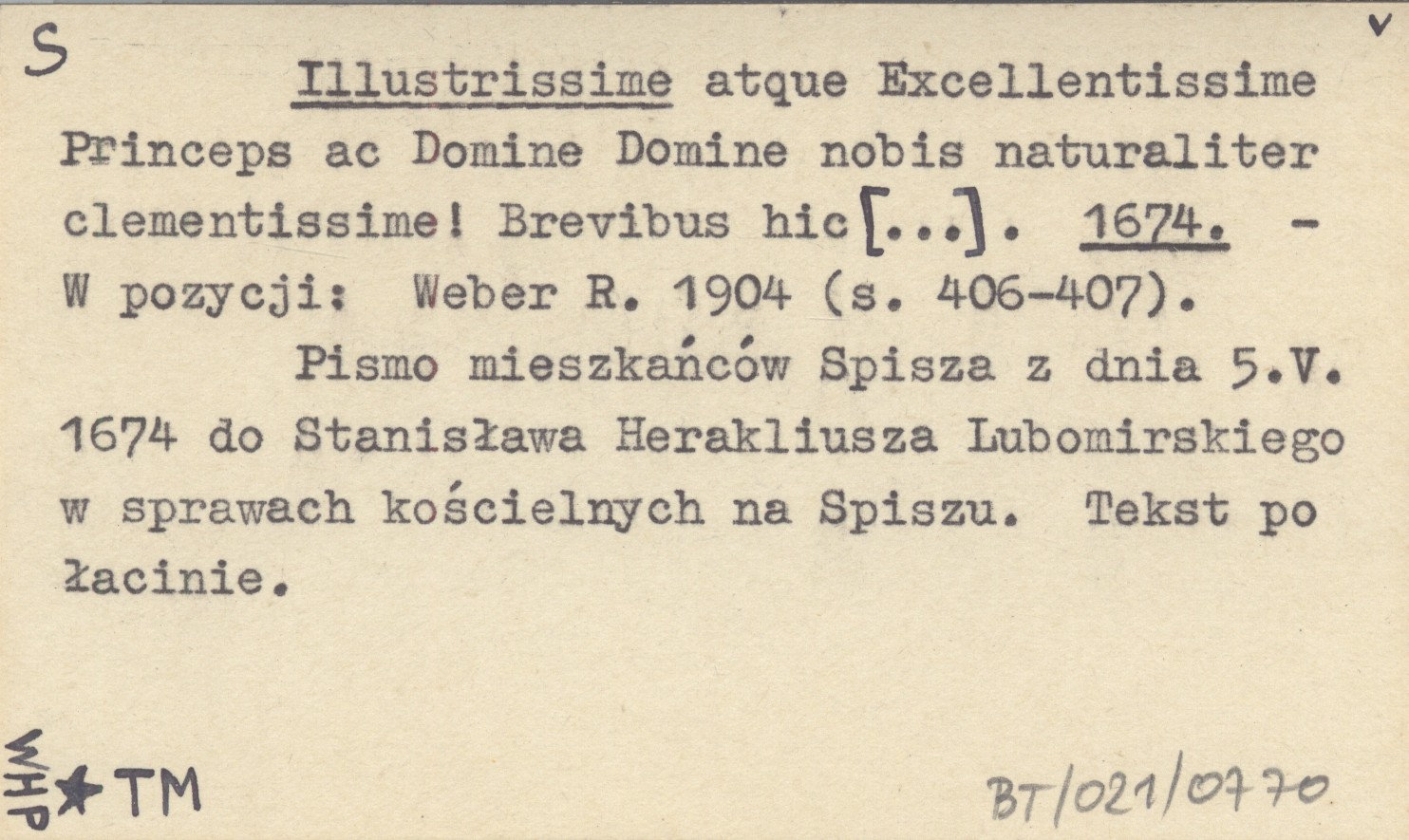 Weber R. 1904: 406-407. , Pismo mieszkańców Spisza z dnia 5.V.1674 do Stanisława Herakliusza Lubomirskiego w sprawach kościelnych na Spiszu. Tekst po łacinie.