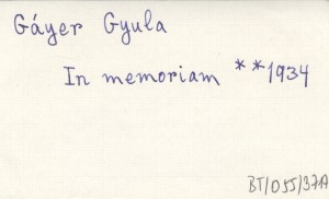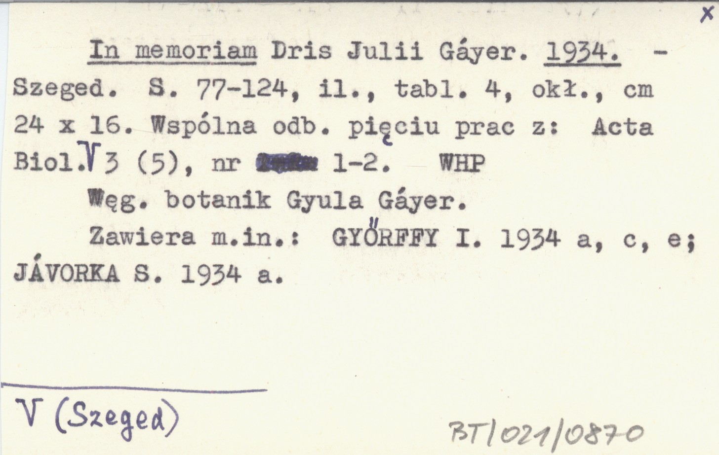Szeged , S. 77-124, il., 4 k., okł., 24x16 cm. Węgierski botanik Gyula Gáyer. Wspólna odbitka pięciu praz z : Acta Biol. (Szeged) 3 (5), nr 1-2. Zawiera m. in.: GYŐRFFY I. 1934 a, c, e; JÁVORKA S. 1934 a.