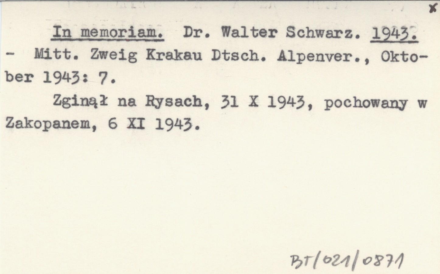 Mitteilungen des Zweiges Krakau des Deutschen Alpenvereins, 10.1943: 7. Zginął na Rysach, 31 X 1943, pochowany w Zakopanem, 6 XI 1943.