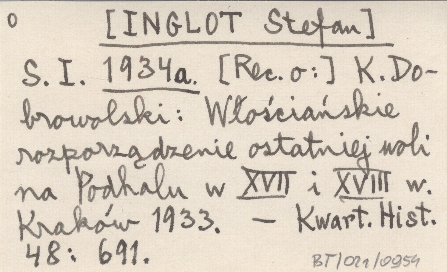 S.I. [INGLOT Stefan] 1934 a K. Dobrowolski: Włościańskie rozporządzenie ostatniej woli na Podhalu w XVII i XVIII w. Kraków 1933.