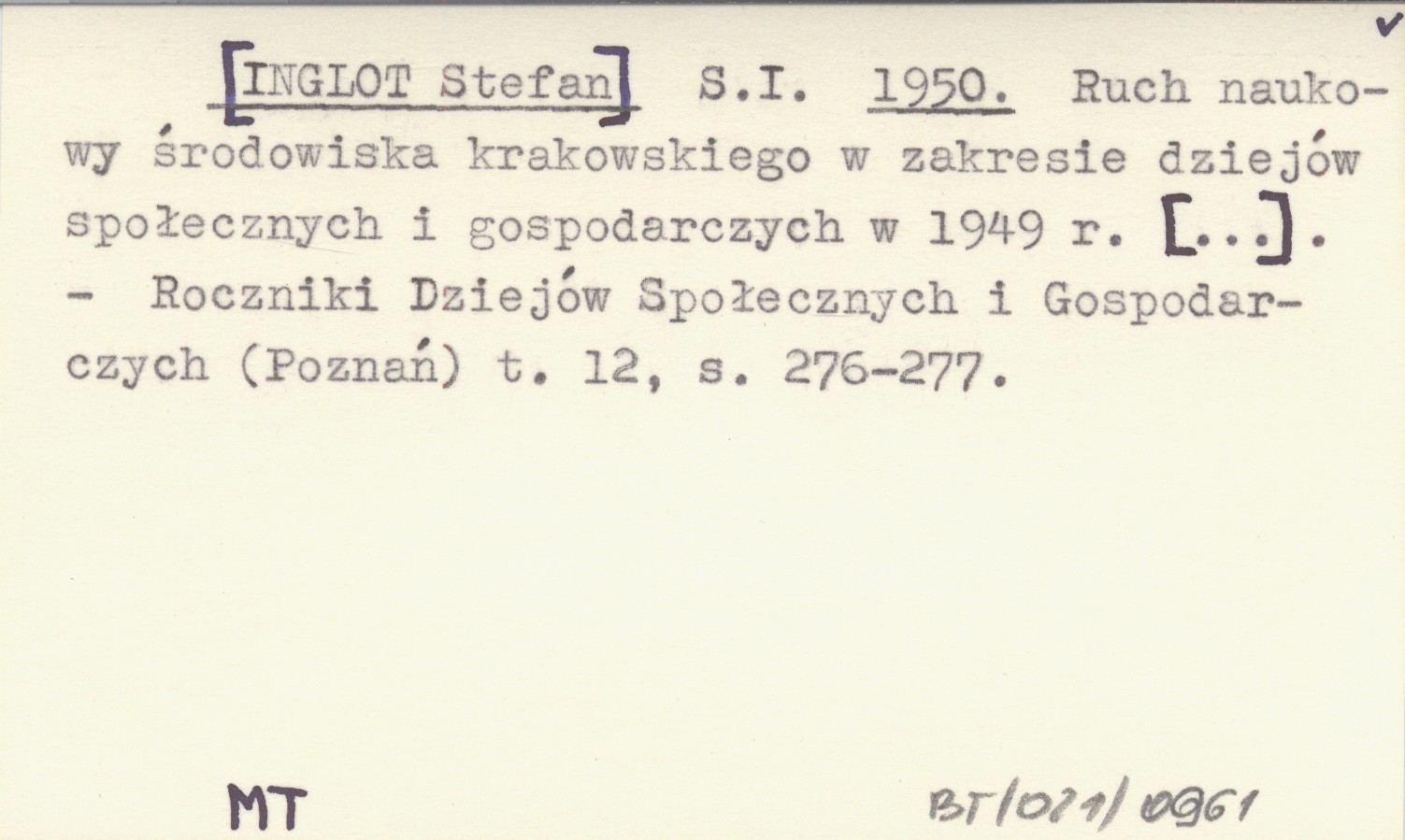 S.I. [INGLOT Stefan] 1950 Ruch naukowy środowiska krakowskiego w zakresie dziejów społecznych i gospodarczych w 1949 r. [...].
