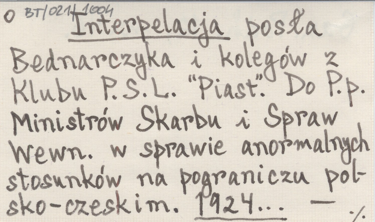 Interpelacja posła Bednarczyka i kolegów z Klubu P.S.L. "Piast". Do P.p. Ministrów Skarbu i Spraw Wewn. w sprawie anormalnych stosunków na pograniczu polsko-czeskim. 1924...