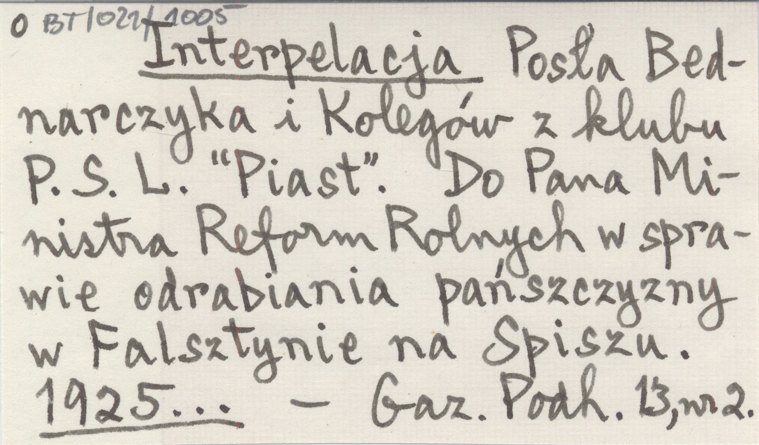 Interpelacja Posła Bednarczyka i Kolegów z klubu P.S.L. "Piast". Do Pana Ministra Reform Rolnych w sprawie odrabiania pańszczyzny w Falsztynie na Spiszu. 1925...