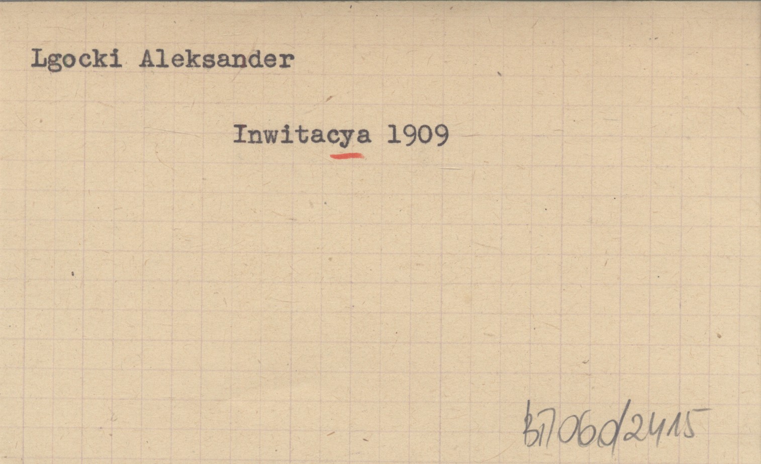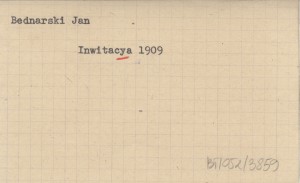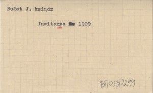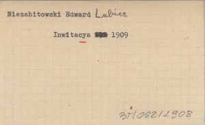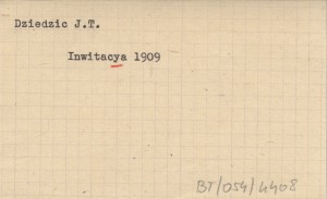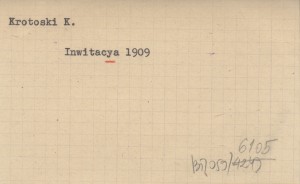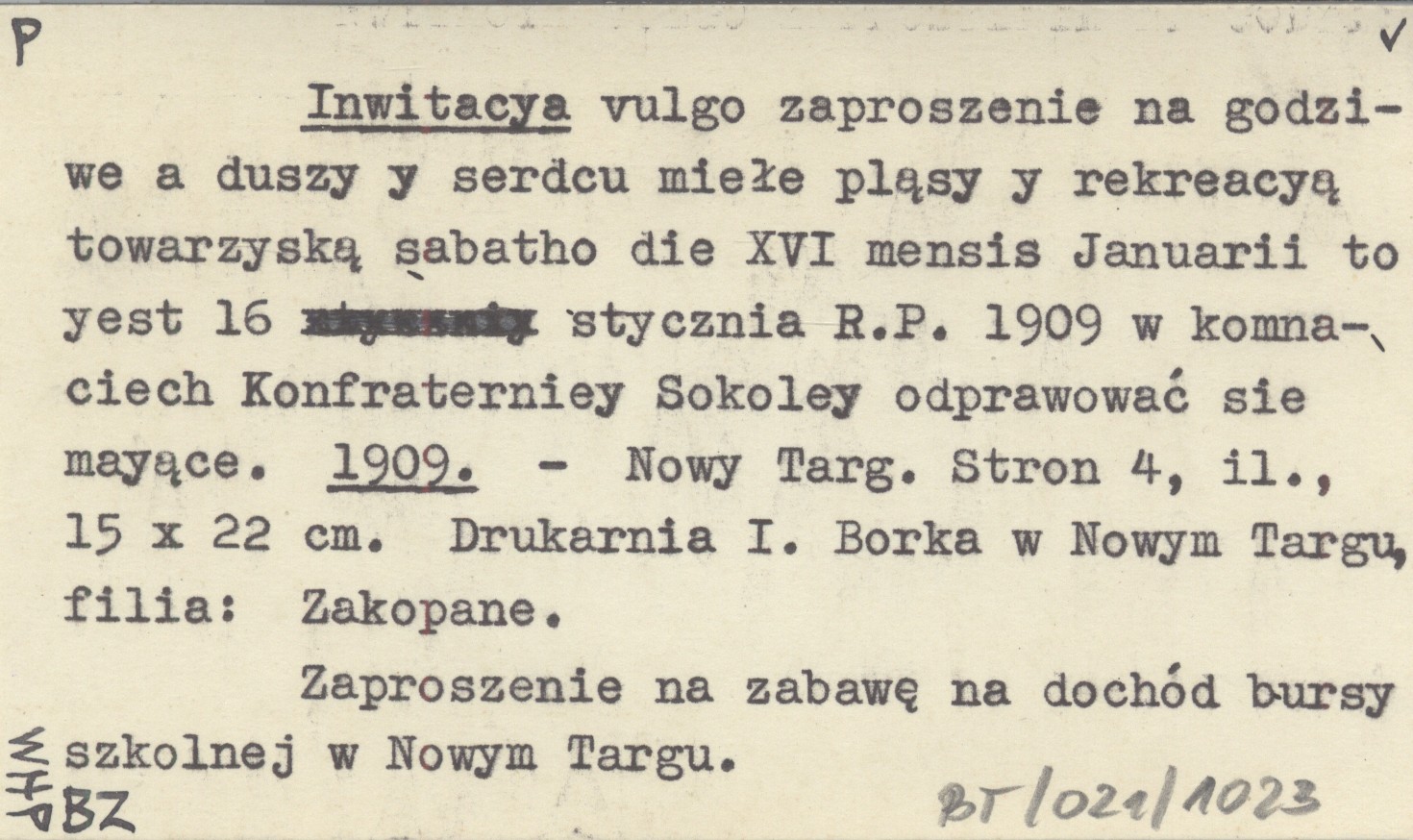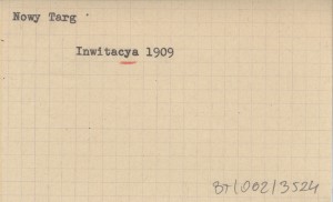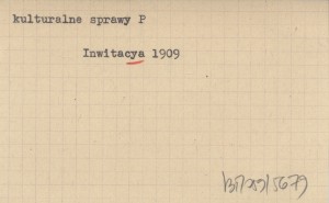 Inwitacya vulgo zaproszenie na godziwe a duszy y serdcu miełe pląsy y rekreacyą towarzyską sabatho die XVI mensis Januarii to yest 16 stycznia R.P. 1909 w komnaciech Konfraterniey Sokoley odpracować sie mayące. 1909