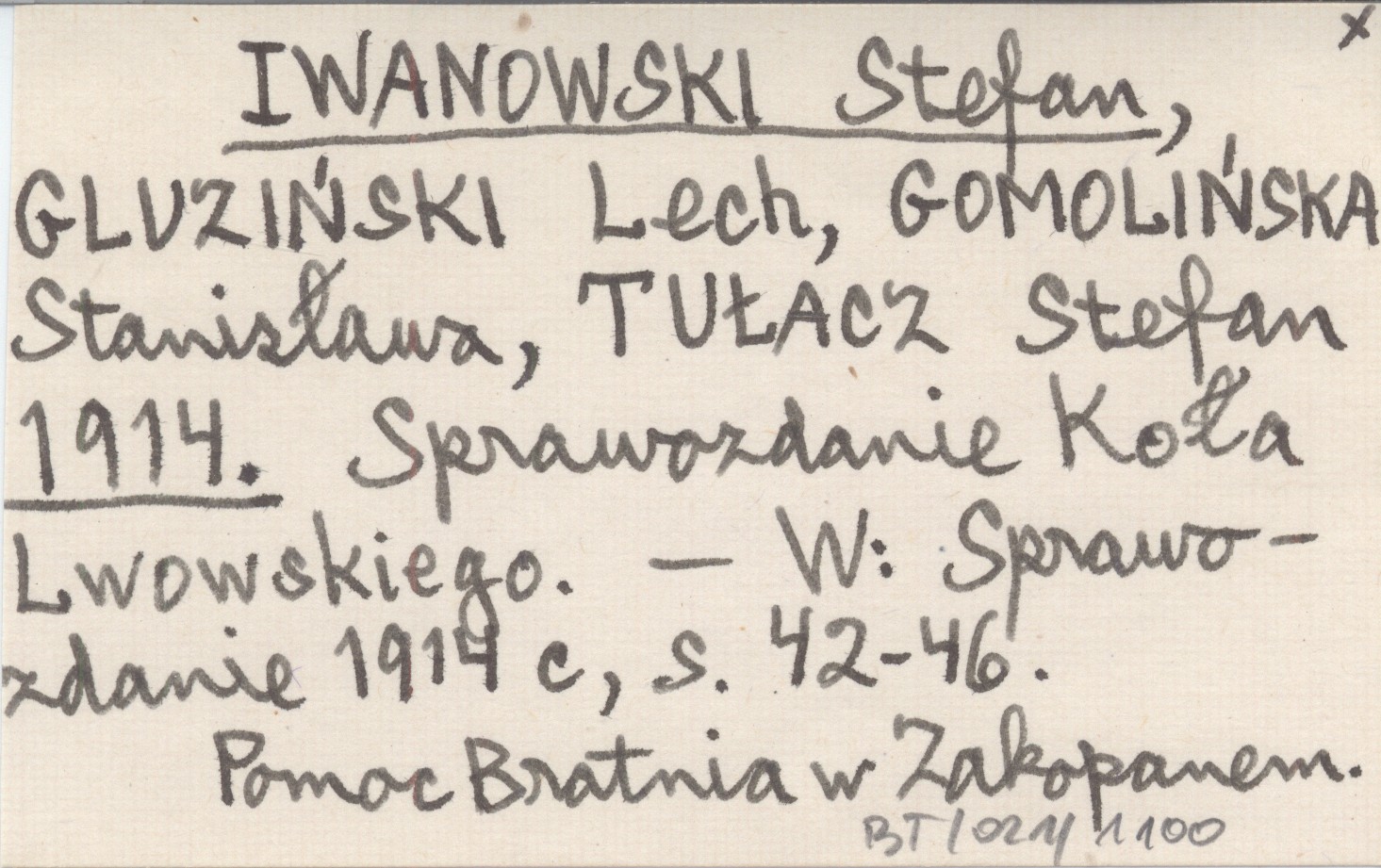 IWANOWSKI Stefan GLUZIŃSKI, Lech. ; GOMOLIŃSKA, Stanisława. ; TUŁACZ, Stefan. ; 1914 Sprawozdanie Koła Lwowskiego.